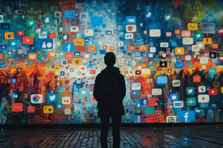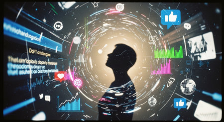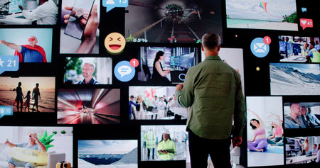 Female face with floating digital screens, pictures and media feeds. Woman surrounded by and social media icons. Concept of online content consumption