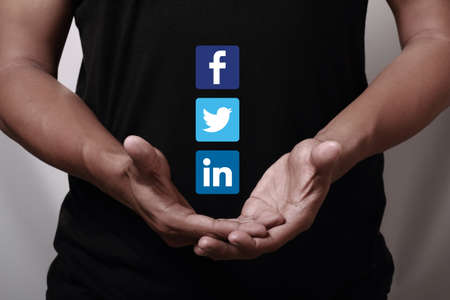 Johor, Malaysia - May 11, 2014 Hand showing Facebook, Twitter and Linkedin icons They are famous social networking websites in the world, May 11, 2014 in Johor, Malaysia