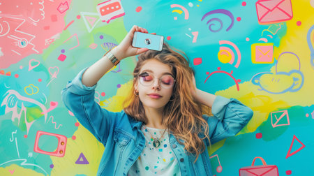 Young Woman Posing With Smartphone Against Colorful Mural in Urban Setting During Daytime