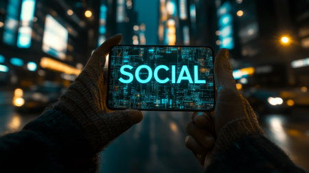 Futuristic interactive holographic social text icon shining over mobile phone in hands
