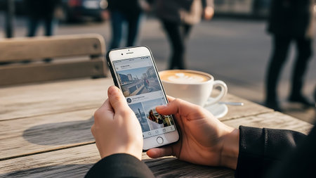 A smartphone rests on a wooden surface, showcasing a vibrant social media feed next to a steaming cup of coffee in a warm atmosphere.