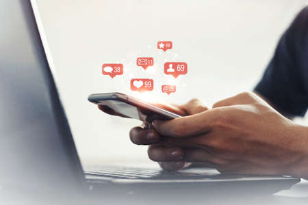 Contact us sms media man use smart phone social media network pop notification icons