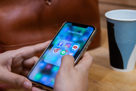Bangkok, Thailand, 13 October 2019: Thai women use iPhone 10 with social media icons.