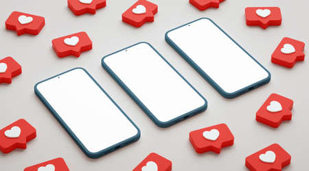 Three blank screen phone mockup surrounded by social media likes. Smartphone display with social network heart button, realistic presentation template in 3D rendering