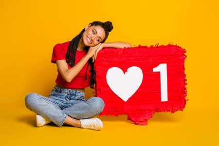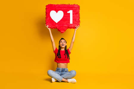 Portrait of skinny glad cheerful girl sitting lotus pose rising up big board one like heart isolated bright yellow color background