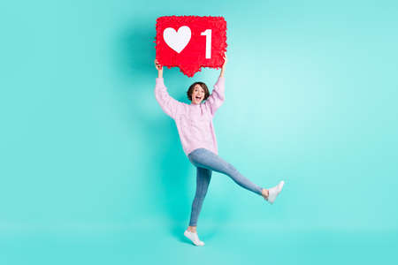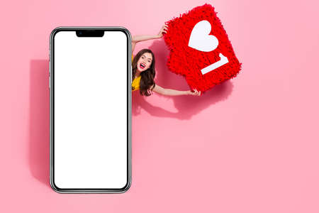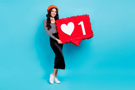 Photo of young attractive girl happy positive smile hold pinata notification icon like isolated over blue color background