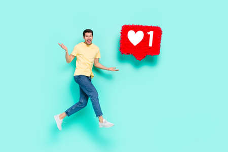 Full body profile photo of nice brunet guy run with like wear t-shirt jeans shoes isolated on turquoise background