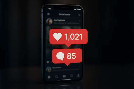 A modern smartphone displays prominent red notification bubbles indicating high social media engagement, with 1,021 likes and 85 comments. The screen shows a blurred social feed in the background, set against a dark, reflective surface. This image visually represents online popularity, digital interaction, and the constant flow of feedback on social networking platforms.