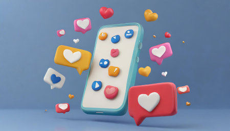 Smartphones are covered with like and comment icons, illustrating the interaction and engagement prevalent in online social communities.