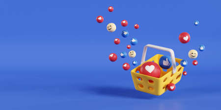 Online shopping banner with 3d shopping cart, clouds and social icons. 3d rendering