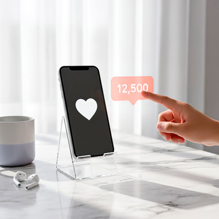 Smartphone mock up features heart icon and engagement metrics, hand interacting with screen, set in a contemporary workspace with coffee cup and earphones, highlighting social media connection