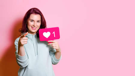 beautiful young woman in a green hoodie smiles and holds a like heart sign in her hand. Horizontal studio shot on pink background, copy space. Social media blogging concept.