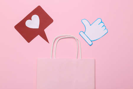 Shopping bag with thumbs up and like notification icons on pink background. Rating, followers feedback. top view