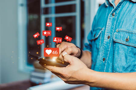 hands of man using smart phone with notification icons of love, like, message, Social, media, Marketing concept, Social media and digital online concept.