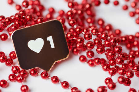 Like heart symbol. Like sign button, symbol with heart and one digit. Social media network marketing. Red glitter beads background.