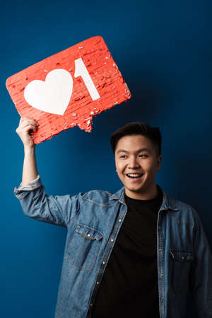Portrait of a cheerful young asian man wearing casual clothes standing isolated over blue background, showing like sign