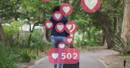 Image of social media heart icons over african american woman riding bicycle in park. global communication technology and social network concept digitally generated image.