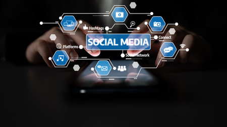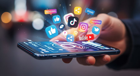This image captures the essence of social media interaction, featuring hands using a smartphone surrounded by digital icons that represent modern communication tools. Tessel