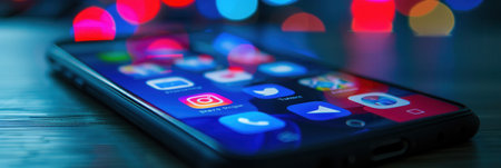 A close-up shot of a smartphone with a social media app feed displayed on the screen, featuring popular app icons. Blurred lights in the background add a vibrant touch.