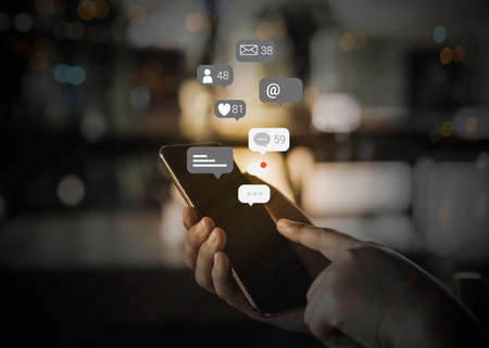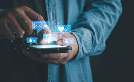Contact us sms media man use smart phone social media network pop notification icons
