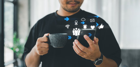 man using smartphone with social web icon popup on the phone in living room at home, man using cellphone for searching data and social media on internet. Technology and people concept.