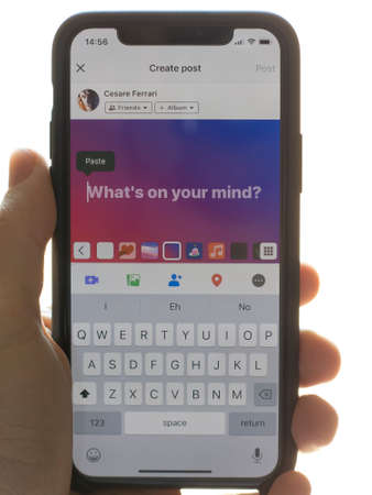Milan, Italy - June 28, 2020: close up on a modern smarphone screen, newly introduced Facebook post reactions are visible on screen.