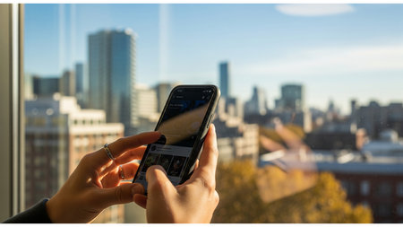 Person using a smartphone in front of a window overlooking the city.