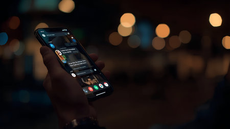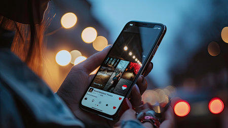 A person interacts with a social media news feed on their smartphone, surrounded by a vibrant cityscape as evening falls.