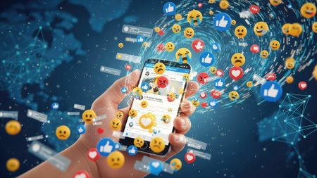 A hand holds a smartphone displaying social media interface surrounded by floating emoticons, hearts, and likes. The composition features a blue background with a world map and digital network nodes. The scene is illuminated with a soft glow, suggesting digital communication. Suitable for illustrating online interactions, social networks, and technology concepts.