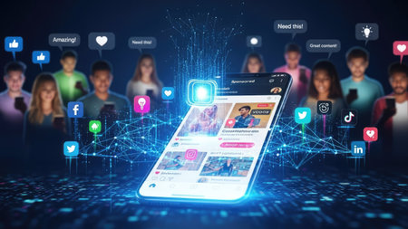 A smartphone display dominates the scene, representing online social interaction. Blurred figures surround the phone, interacting with glowing icons that suggest communication. The composition utilizes a digital aesthetic with neon colors and intricate light patterns, set in a dark environment, possibly for advertising. Suitable for content related to technology, communication, and digital marketing.