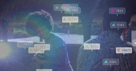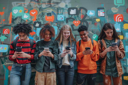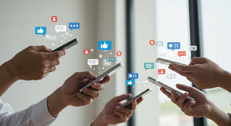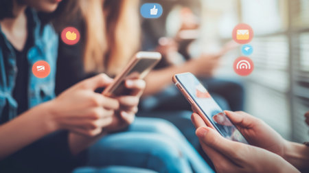 Group of people using mobile phones with colorful social media notifications. Engagement and online activity concept.