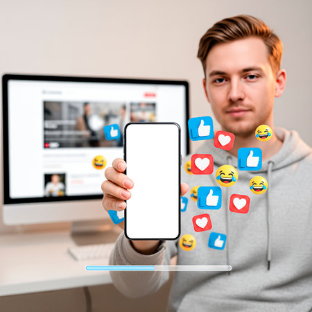 Male individual displays smartphone with empty screen, surrounded by vibrant social media icons, showing the concept of digital communication and online presence