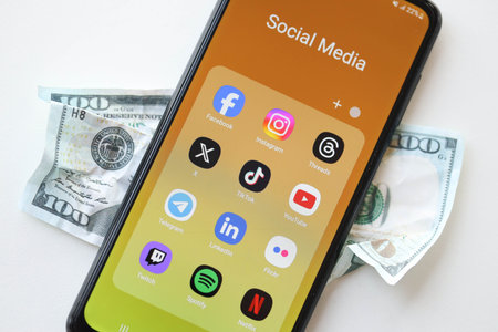 KYIV, UKRAINE - FEBRUARY 28, 2024 Social Media on smartphone display and crumpled dollar bill as concept of spend money to social networks and media services