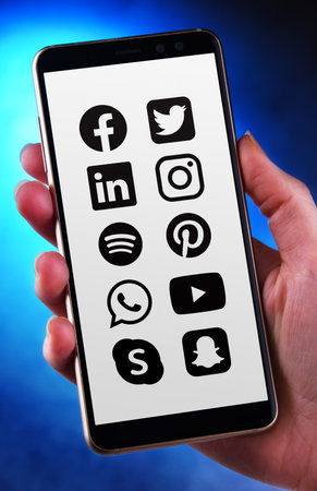 POZNAN, POL - MAY 21, 2020: Hand holding smartphone displaying logos of popular social media platforms