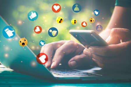 Person hand using a mobile phone with social media marketing concept.