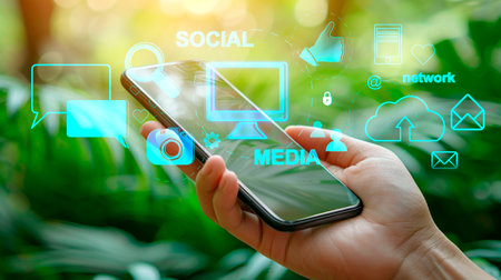 Hand holding smartphone with social media concept icons floating above, on a blurred green natural background, depicting digital connectivity. Generative AI