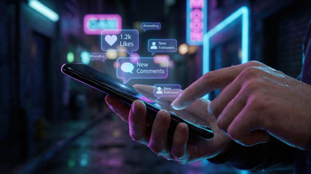A person interacts with social media on a smartphone, receiving notifications in a futuristic, cyberpunk-inspired setting