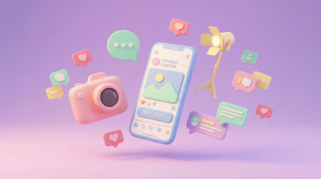 This colorful illustration depicts the tools and elements of social media content creation, perfect for marketing and advertising