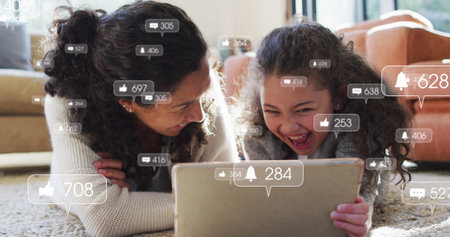 Image of icons with growing number over biracial woman and her daughter using tablet. Global social media and digital interface concept digitally generated image.