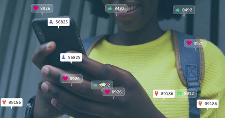 Image of social media numbers with icons over caucasian woman using smartphone. Global networks, business, finances, computing and data processing concept digitally generated image.