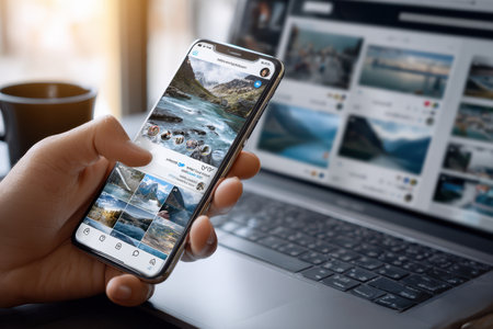 A person interacts with social media on their smartphone while sitting next to a laptop at a cozy workspace.