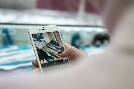 Moscow, RUSSIA - August 20th, 2017: Young woman holding smartphone with search page screen of Instagram application. Instagram is largest and most popular photograph social networking.