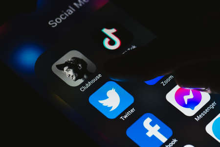 Clubhouse application view on the smartphone, controversy 2021 that hides behind the Social app. Clubhouse drop in audio chat application view on the smartphone
