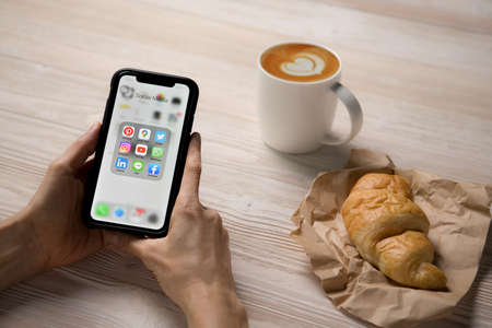 BANGKOK, THAILAND - April 14, 2020 : Person holding Iphone xr with icons of social media on the screen at the coffee shop