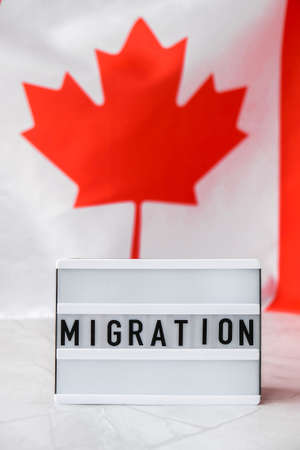 The National Flag of Canada. Lightbox with text MIGRATION Canadian Flag or the Maple Leaf. Patriotism. International relations concept. Independence day. Immigration