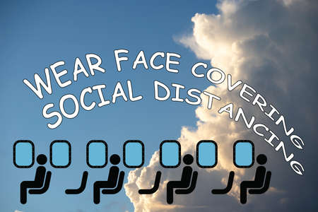 Commercial aircraft passengers practicing social distancing and advised to wear face coverings as countries prepare to unlock restrictions due to pandemic isolated on cloud background
