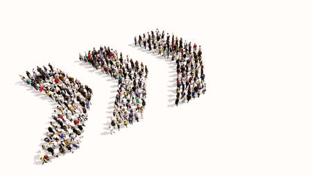 Concept conceptual large community of people forming the dangerous turn road sign. 3d illustration metaphor for caution, warning, safety and guidance