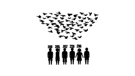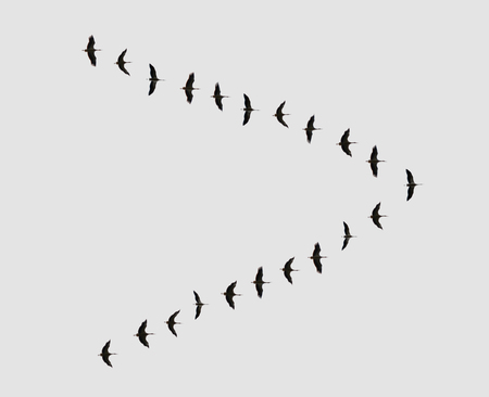 Many birds flying in clear v shaped formation on bright white background migration flock silhouette concept for nature border poster and seasonal travel design
