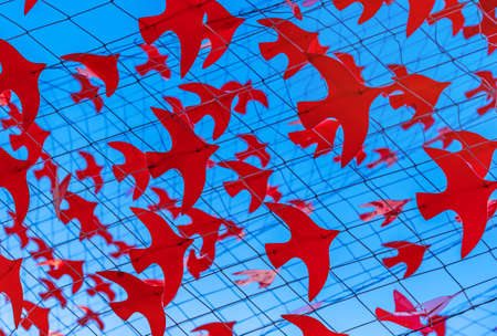 A network of red birds, pigeon, dove on a blue sky background. Peace sign and symbol.