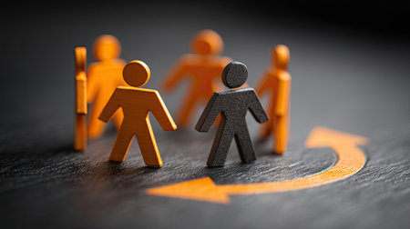 This image showcases a circular arrangement of orange and black figures representing a collaborative group. The composition emphasizes teamwork and connection, reflecting unity and strategic engagement in a professional or social context.